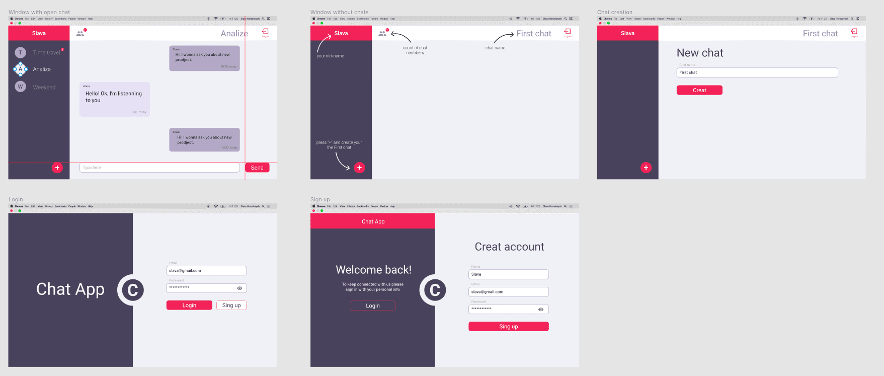 I asked my wife if she is able to help me a bit with the UI part and this ended up in series of few nice mockup of our chat app.
